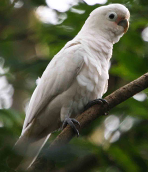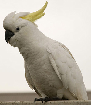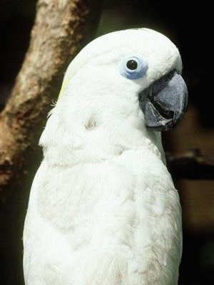 A cockatoo is any of the 21 bird species belonging to the family Cacatuidae. Along with the Psittacidae family (the true parrots) and the Nestoridae family, they make up the order Psittaciformes. The name cockatoo originated from the Malay name for these birds, Kaka(k)tua (either from kaka "Parrot" + Tuwah, or "older sister" from Kakak "sister" + Tua, "old"). Placement of the cockatoos as a separate family is fairly undisputed, but it is not resolved whether or not other living lineages of parrots (such as the Lories and Lorikeets) are as distinct as they appear. The family has an Australasian distribution, ranging from the Philippines and the eastern Indonesian islands of Wallacea to New Guinea, the Solomon Islands and Australia.
